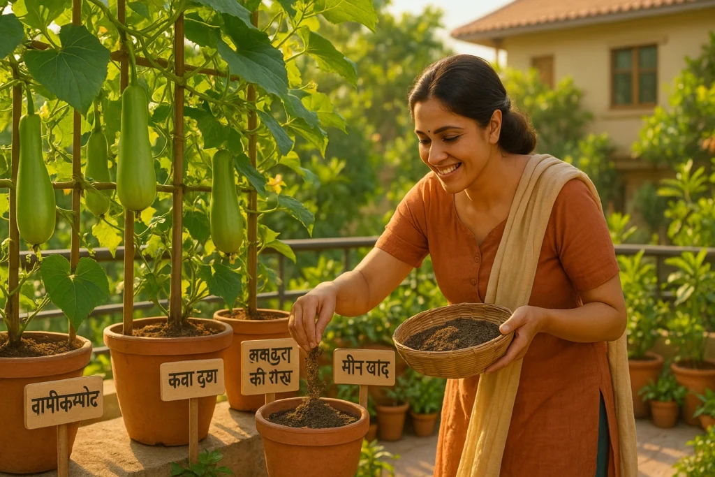 वर्मीकम्पोस्ट एक जैविक खाद है जो पौधे को बैलेंस्ड न्यूट्रिशन देती है। इससे पौधे की जड़ें मजबूत होती हैं और फूल-फल की संख्या बढ़ती है। इसे हर 15 दिन में 2 मुट्ठी डालने से पौधा ऊर्जा से भर जाता है और बेल लंबी-लंबी हरी लौकियों से लद जाती है।